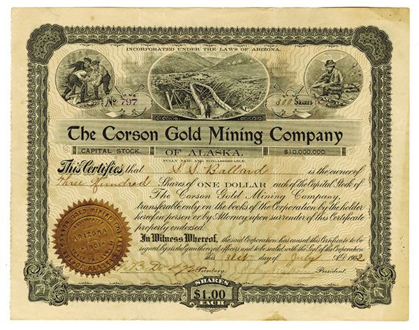 Alaska, 1902. 300 Shares. I/C stock. Black border. Miners working with sluice vignette. VF condition with light toning. Goes style certificate. Incorporated AZ.
