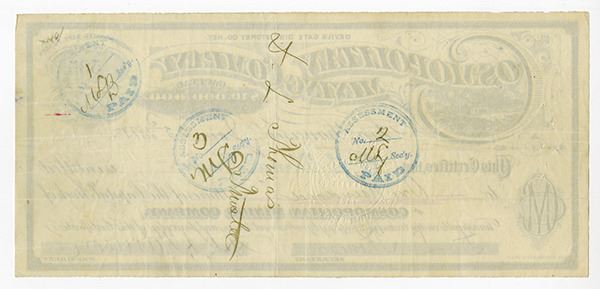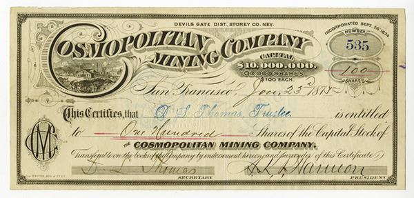 Devils Gate District, Storey County, Nevada. 100 Shares, I/U, Black with ornate title with small mining scene in the large letter "C", S/N 535, VF to Choice VF.