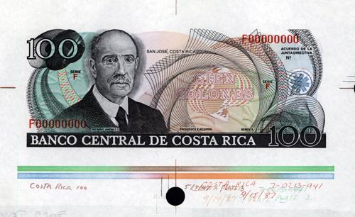 San Jose, Costa, Rica. Dated on specimen 1987 ( issued 1988), 100 Colones, Ser.F, P-254s Unlisted as single impression large margin specimen. Jimenez O on left, S/N "00000", large margins with guide lines and holes for guiding plates for accurate printing registration. The format is very uncommon of single impression Large Die Specimens printed on both sides, usually this was reserved for proofs printed uniface only. The face has notation on bottom "Good" and the back has the word "Spoil". Color bars on bottom as well as engraved notes directly into the plate with dates. Rare Archival production specimen. ABNC.