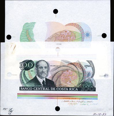 1987. P-254. 100 Colones Specimen P-254 with large margins on white paper dated 10-20-87. The front is almost fully printed and the back of the note is only an undertint. Also included is a color separation of the undertint used on the front and back of the note. Scarce group. Unc. Condition. Unc. ABNC.
