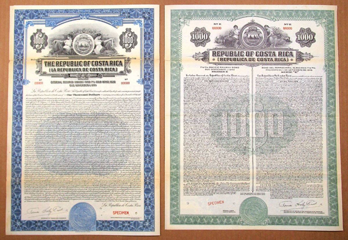 Costa Rica, 1926-27. $1000 Specimen Pair of Coupon Bonds one with blue border and other with green border. Both have allegorical women flanking arms at top, Specimen overprints, Archivally reinforced folds, POCs, and both printed by ABNC. (2). Sold "AS IS" no returns accepted.