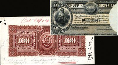 18--; 1884. P-121p; 124, 10; 100 Pesos Front proof of P-121 with 1/4 of note cut off on right, otherwise appears AU. Printed in black. Back of P-124 approval proof mounted on large card, signed and approved. Unc. Scarce notes. ABNC.