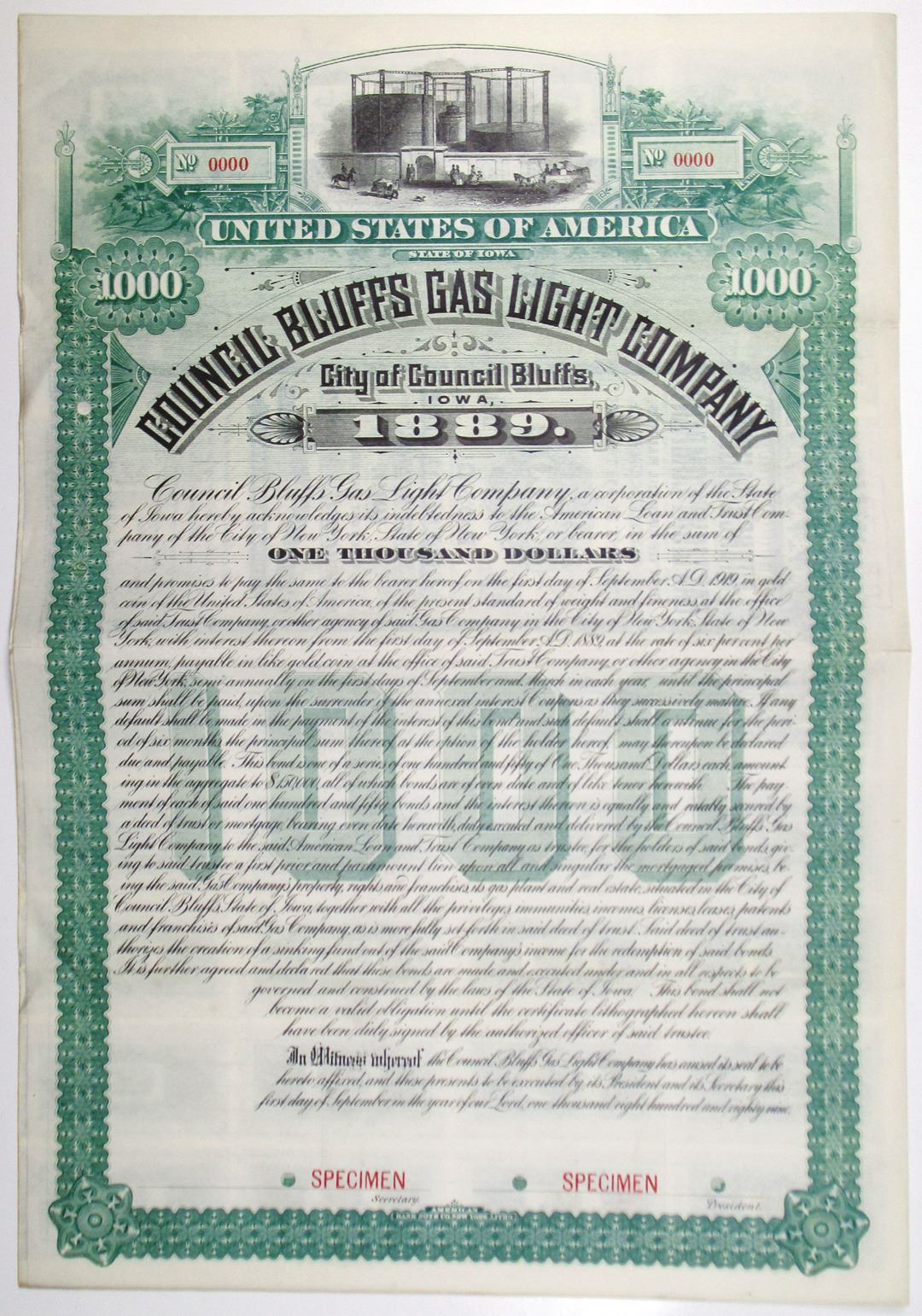 Iowa, 1889. $1000 Specimen 6% First Mortgage Coupon Bond, Black text with green border and underprint, Utilities building at top center with people outside. Red specimen overprints, 0000 serial numbers, and POCs. Fine to VF condition, ABNC.
