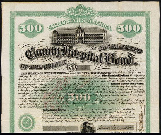 California, 1870, $500, 1st Mortgage 5% Gold Bond, Issued and cancelled Bond, Black on green border and underprint, Hospital top center and moving locomotive bottom center, VF-XF condition, Britton & Rey Lithographs. Scarce early California bond for interesting subject.