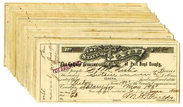 An assortment of Country Treasurer of Fort Bend County bearer checks for various amounts, all dated 1896-1902, cancelled and paid. Generally Very Fine condition.