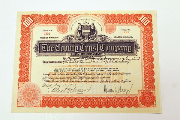 Pennsylvania. 100 Shrs Stock Certificate. I/U. Very Fine +.
