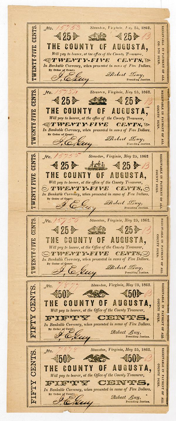 Staunton, VA. May 25, 1862, Uncut Issued sheet of 25cts-25cts-25cts-25cts-50cts-50cts. Black on light beige paper, large margin at left, cut close at right, red serial numbers and all have the letter "B" on the top right corner, the grade varies between Choice XF to Choice AU condition. All with printed signature of Robert Guy and hand written signature.