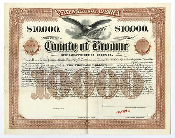 New York. $10,000 Specimen 4% Registered Bond, Black print on brown border and under tint on horizontal format, Bald Eagle with flag at top, Specimen overprints and POC's, VF-XF condition, ABNC.