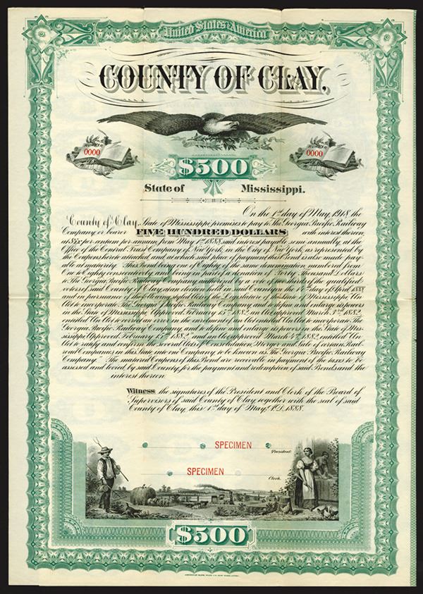 Clay, Mississippi. $500 Specimen 6% Coupon Bond, Black print on green border and under tint, Large Bald Eagle at top under bond title, Specimen overprints and POC's, Fine-VF condition with splitting along fold lines, ABNC.