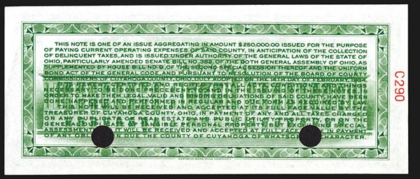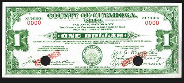 Cuyahoga, Ohio, 1934, $1, Specimen banknote, Green with no underprint, back green, Specimen overprints, POC's, Republic BNC. AU-Unc.