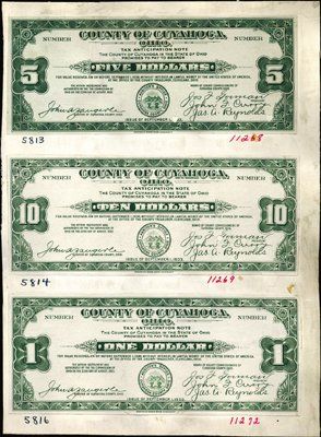Ohio. Issue of Sept. 1, 1933. $1; $5; $10; $20. "Tax Anticipation Note". 4 different proof face notes and 3 different proof back notes printed in green on thin white paper and mounted to a thin white card. Cuyahoga County Arms on bottom. All have POC's. The $20 is cut close to the left border. Condition varies between Fine and XF. Scarce group of Ohio depression scrip. RBNC