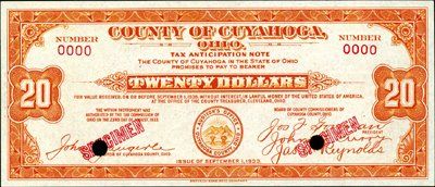 Ohio. 1933. $1; $5; $20 3 different specimen banknotes. The $1 and $5 are dated December 20, 1933 and the $20 is dated September 1, 1933. All have red specimen overprints, POC's and "00000" serial numbers. The $1 is green, the $5 is brown and the $20 is orange. The backs match the face color. The $1 and $5 are printed by Quayle & Son Corp, NY and the $20 is printed by Republic BNC. The $1 and $5 are AU and the $20 is choice Unc. Rare specimen set. Republic BNC.