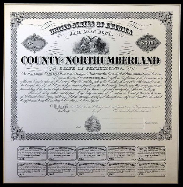 Pennsylvania, 14.5 x 14 inches, matted in cardboard frame, $500, 6% Jail Loan Bond, Printed on thick paper, XF. Rare railroad. (R.M.Smythe, 1992, Lot 5592).