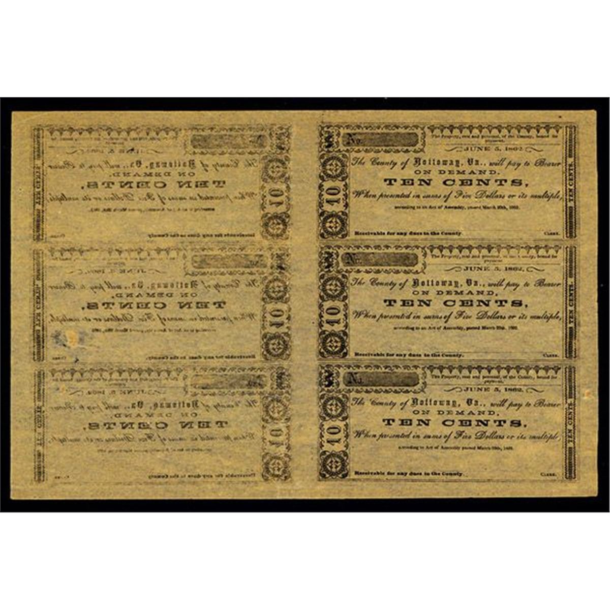 Nottoway, VA. June 5, 1862. Uncut sheet of 6 notes, 10cts-10cts-10cts/10cts-10cts-10cts with second vertical row on the left facing backwards. AU to Unc condition. Scarce unissued Sheet.