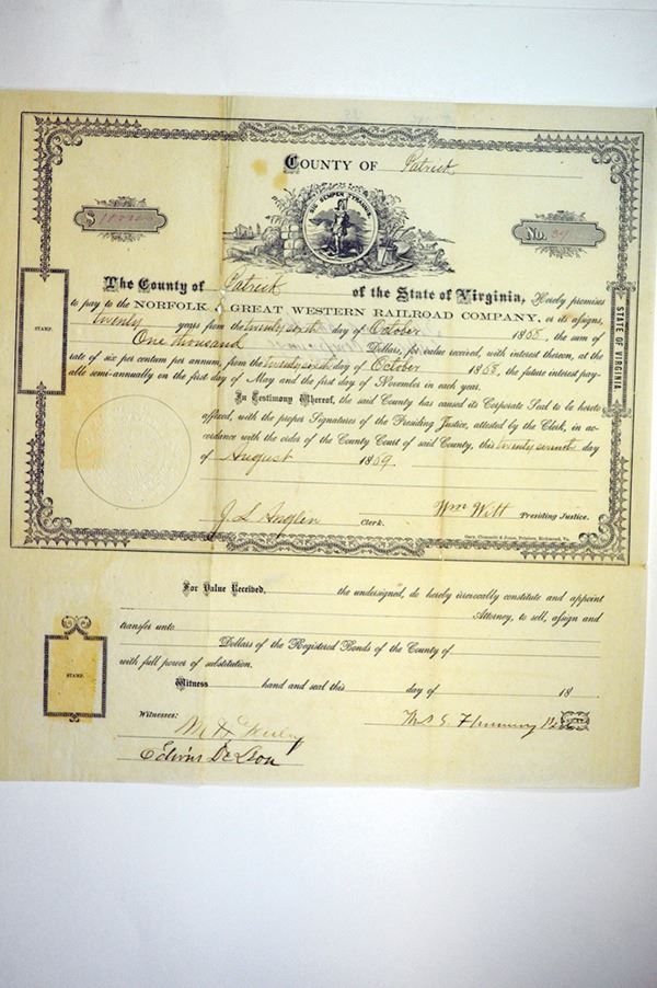 VA. $1000 Bond. Revenue stamp removed. Paper separation at some folds. Very Fine. Tone.