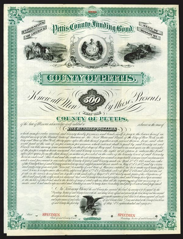 Pettis, Missouri. $500 Specimen 6% Coupon Bond, Black print on green border and under tint, State seal of Missouri at top flanked by images of cattle and farming, Specimen overprints and POC's, Fine condition with toning and cracking along margins, CBNC.
