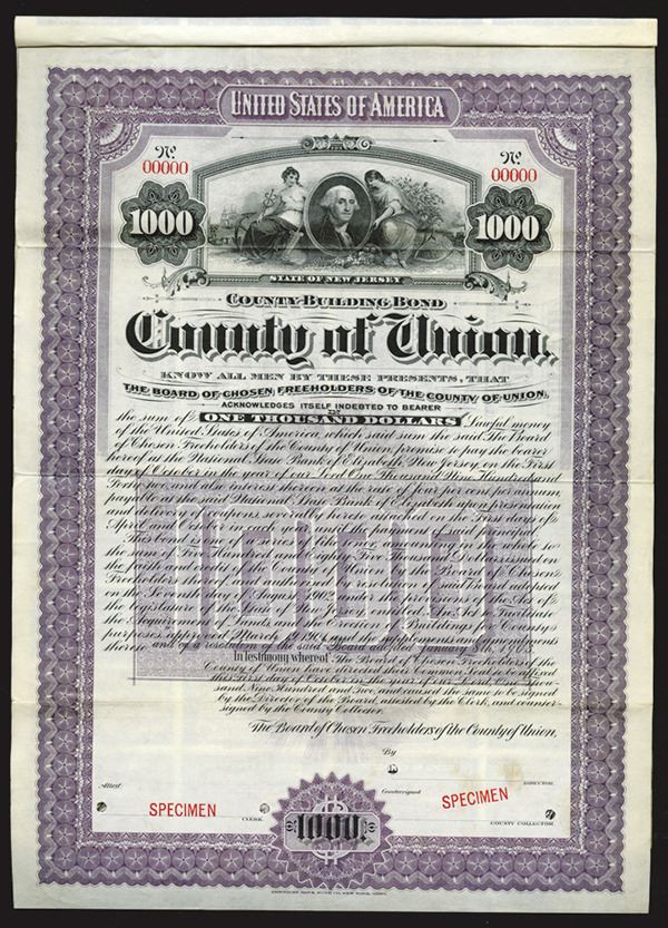 Union, New Jersey. $1000 Specimen 4% County Building Coupon Bond, Black print on purple border and under tint, Allegorical women flank portrait of George Washington at top, Specimen overprints and POC's, Fine condition with minor splits along fold lines, ABNC.