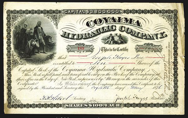 Coyaima Hydraulic Company, 1876 with Impressive Christopher Columbus vignette. Colombia. (Incorporated in New York), 1876, 10 Shares, I/U, 3 x 3 inch vignette of Columbus in sight of land, engraved by National BNC, S/N 189, VF with toning on the left side, a repaired 1 inch split at the left middle fold and slight splitting on the right middle fold, First time seen by cataloger as well as very possibly unique. The vignette is very similar to the vignettes found on early National Banknotes that contained engravings by NBNC. The mines were located near the Venezuela-Colombia border.