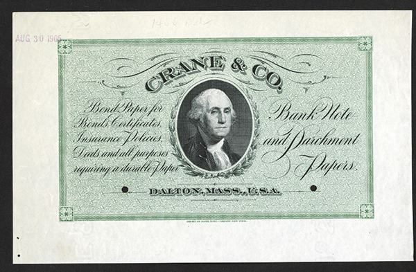 Dalton, Massachusetts. Black Intaglio on green under print, Printed Label specimen for Crane & Co. Paper Makers, AU condition. Crane & Co. are the paper makers for U.S. Currency.