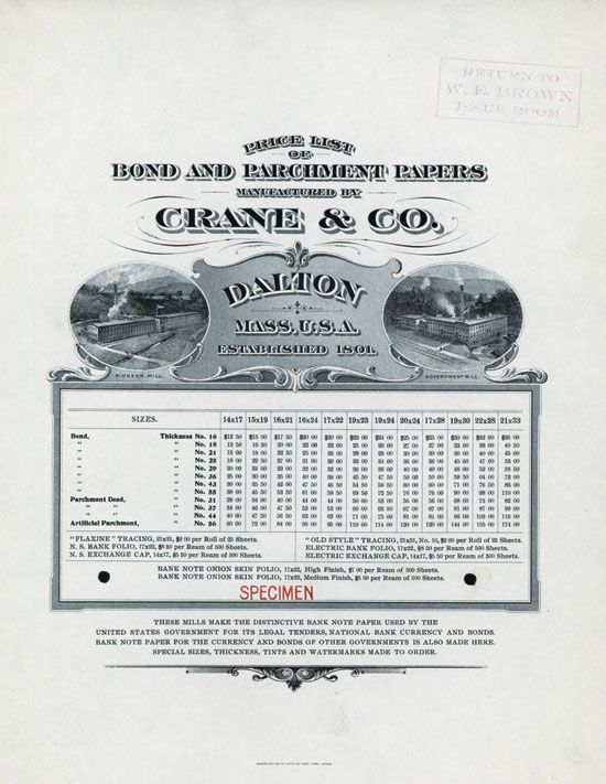 Dalton, Massachusetts, ND (ca.1890's), Litho price list for bond and parchment papers with red SPECIMEN overprint and security punches at bottom, XF condition, ABNC.