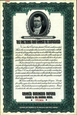 Dalton, MA. 1920-1930. Specimen advertising sheet in the form of a bond with borders surrounding text and vignette of Zenas Crane, Founder of Crane & Co. 10 by 15 inches. Green border. Bottom of advertising sheet states "Designed and Engraved by the ABNC". Rare Crane - ABNC advertising piece. ABNC.