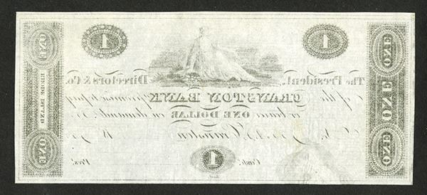 Cranston, Rhode Island, $1, Proof, RI-65-G3, Black on white india paper, Seated allegorical reaper at top, AU with evidence of wrinkling possibly due to removal from previous mounting, Reed, printer.