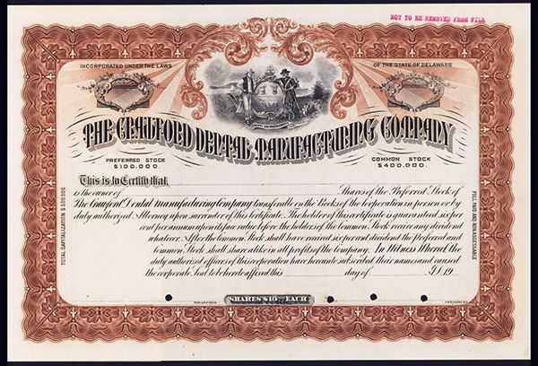 Delaware. Odd Shares Preferred Stock Specimen Certificate, Black print on brown border and under tint, State seal of Delaware at top, POC's, Fine-VF with toning over certificate condition.