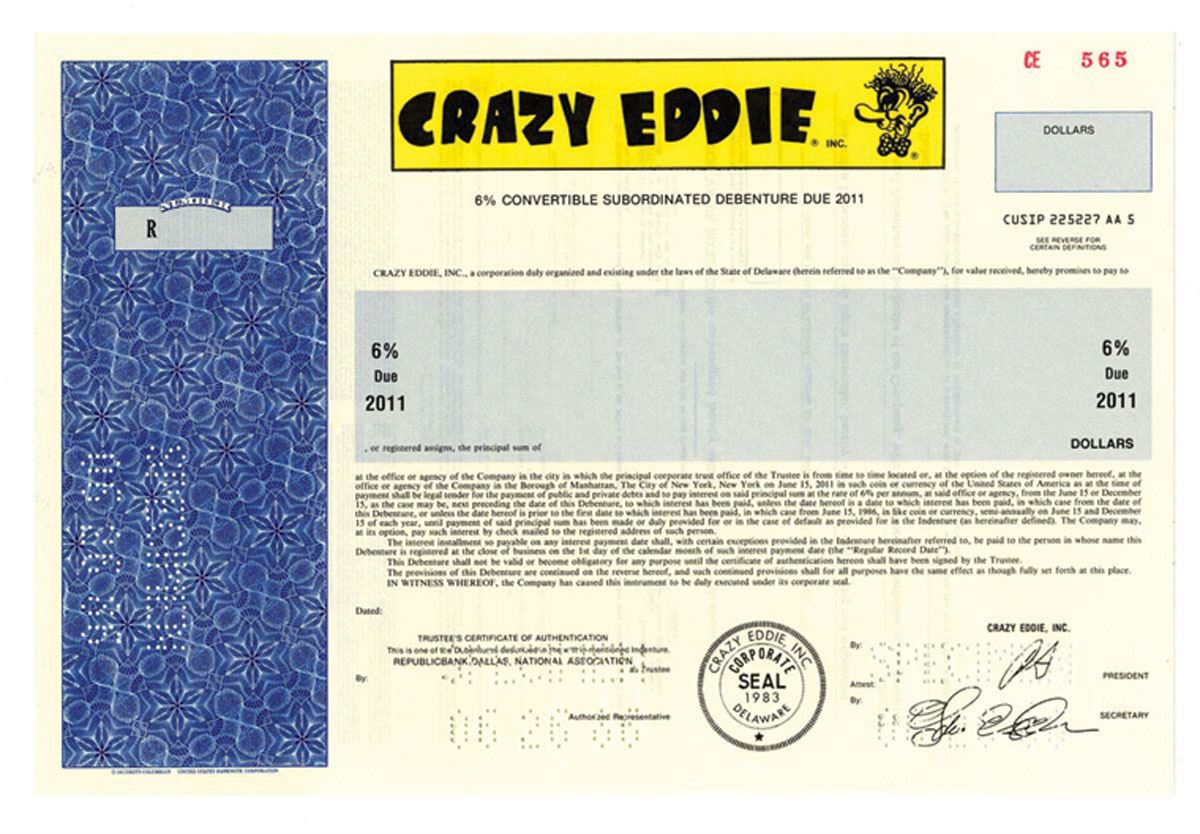 1986. $ Odd. Specimen stock certificate. 6% Due 2011. Pin punch "Specimen - 06-26-86". Blue border. Choice uncirculated. In 1989, the Securities and Exchange Commission filed a civil action against Crazy Eddie founder Eddie Antar and a group of former executives, accusing them of manipulating the value of the company's stock by overstating profits and sales in financial reports. The complaint alleged that Antar, members of his family, and company executives engaged in securities fraud and insider trading from the time the company first went public in 1985 until 1989. Antar, the complaint charged, made over $60 million from the conspiracy, selling off stock just before the real results of Crazy Eddie's evidently at best marginally profitable operations became public. In 1989 the chain suffered a major scandal when Eddie Antar and his family were accused (and eventually convicted) of "cooking the books" in order to skim money and inflate inventory. Antar was found to have sold used electronics as new, committed insurance fraud, faked inventory, and skimmed most of the cash payments to avoid taxes. Having taken the company public (the stock was soon worth hundreds of millions), Antar began selling his stock and the stock price began to collapse. The firm was bought in a hostile takeover by another company, but the buyers were quick to find that some $80 million in inventory did not exist. Antar fled to Israel using the name David Cohen, where he lived until 1994 when he was extradited back to the United States. He was subsequently sentenced to eight years in jail, ordered to pay over $150 million in fines and also owes more than a billion dollars from civil suits. Extremely rare stock that is "INSAAAANE!!" SC-USBNC.