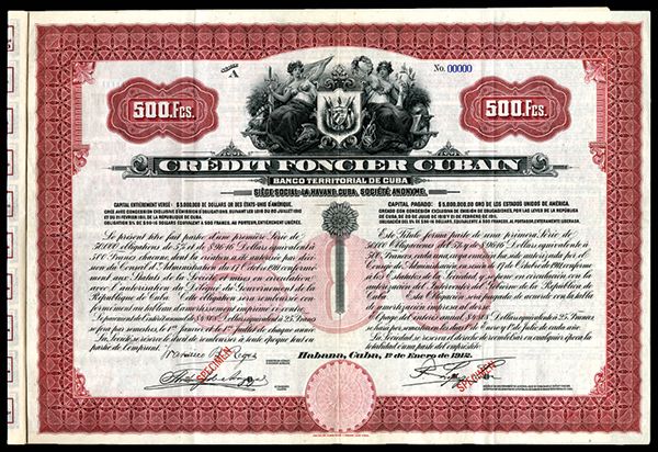 Credit Foncier Cubain, Banco Territorial de Cuba 1912 Specimen Bond. Havana, Cuba. 1912, 500 Francs, red border. Allegorical women flanking Arms of Cuba. Red SPECIMEN overprint and POC. XF Condition. Coupons attached. ABNC.