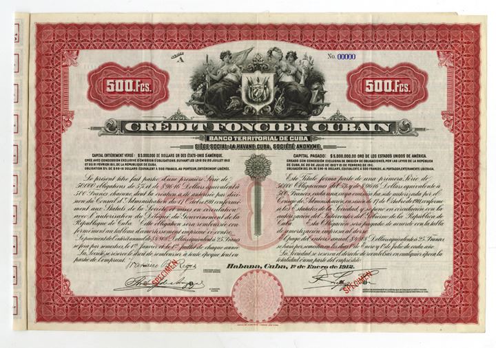 Havana, Cuba. 1912, 500 Francs, red border. Allegorical women flanking Arms of Cuba. Red SPECIMEN overprint and POC. XF Condition. Coupons attached. ABNC.