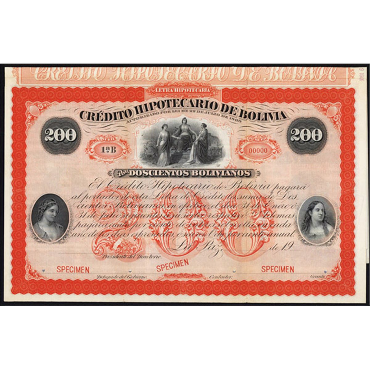 La Paz, Bolivia, “Lei de 22 de Julio de 1869” Issue, dated 19xx (ca.1900-1920), 200 Bolivianos. Orange-red border and undertint with 3 allegorical women on top and allegorical young women on LL and LR. Coupons attached. Red specimen overprints and POC's. XF condition. National BNC. Very attractive bond.