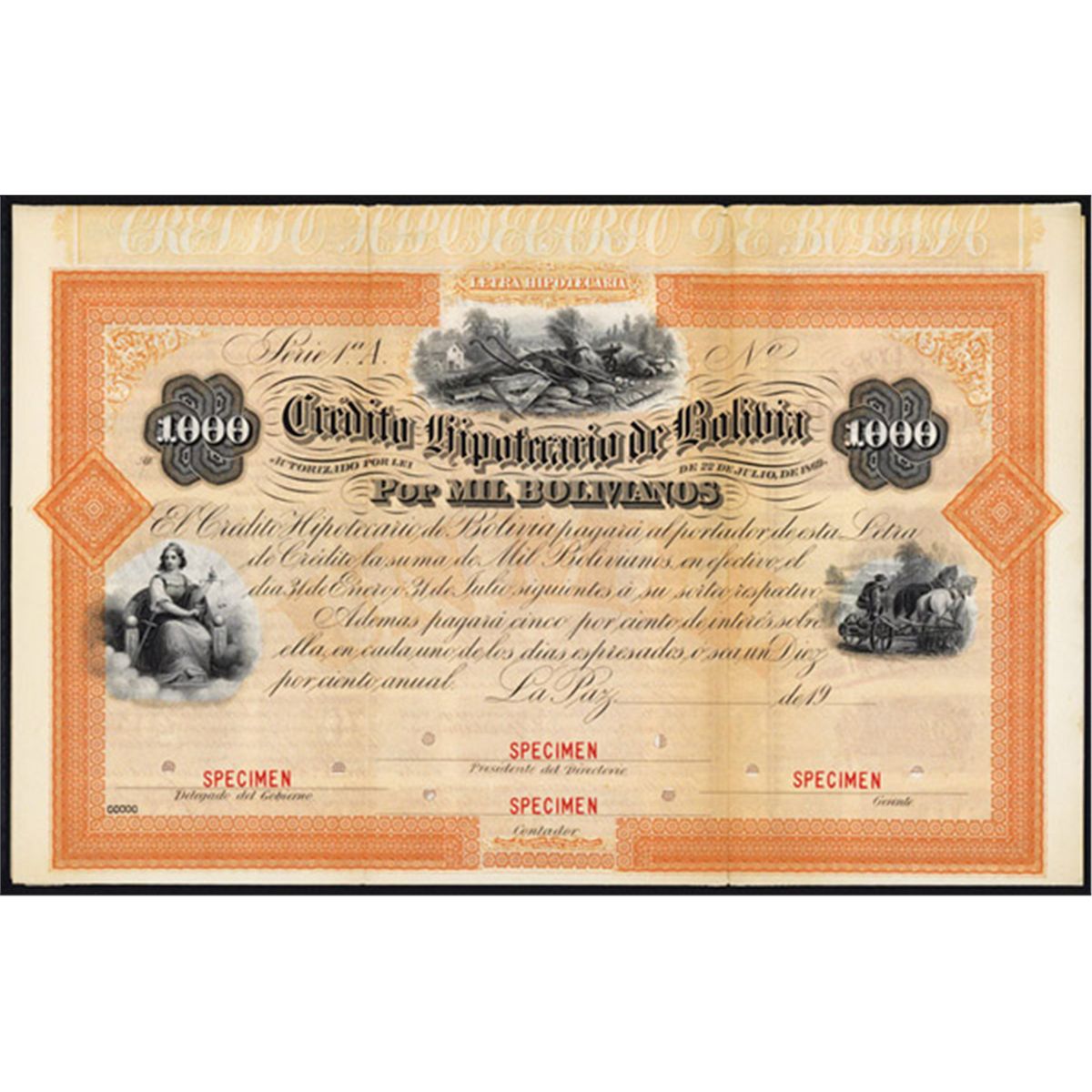 La Paz, Bolivia, “Lei de 22 de Julio de 1869” Issue, dated 19xx (ca.1900-1920), 1000 Bolivianos. Orange border and undertint with farm goods and implements on top flanked by man plowing on LR and seated justice on LL. Coupons attached. Red specimen overprints and POC's. National BNC. Very attractive and early National Bank Note company bond design.