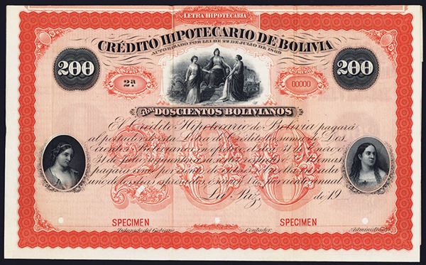 Bolivia, 19xx, 200 Bolivianos, Specimen Bond, Black on red border and underprint, Vignettes on left and right of women and top center of three allegorical women, VF-XF condition, ABNC.
