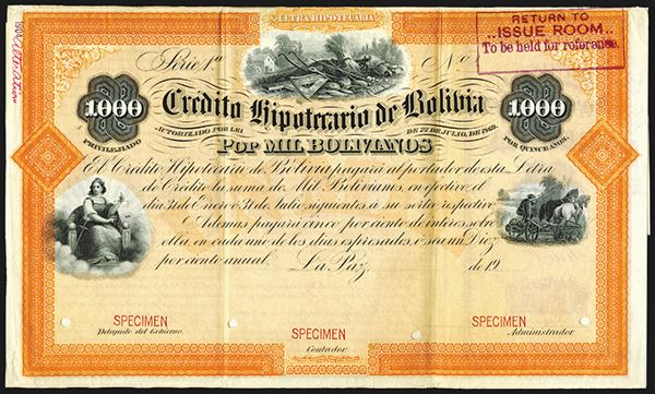 La Paz, Bolivia. "Lei de 22 de Julio de 1869" Issue. 19-- (ca.1900-1910). 1000 Bolivianos. Orange border and undertint with farm goods and implements on top flanked by man plowing on LR and seated justice on LL. Coupons attached. Red specimen overprints and POC's. National BNC. Very attractive bond.