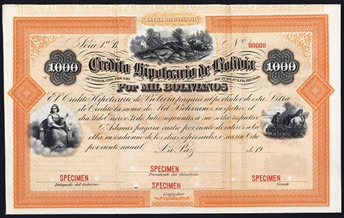 Bolivia, 19xx, 1000 Bolivianos, Specimen Bond, Black on orange border and underprint, Vignette of farm top center with man harvesting field mid right and allegorical woman sitting mid left, VF-XF condition, ABNC.