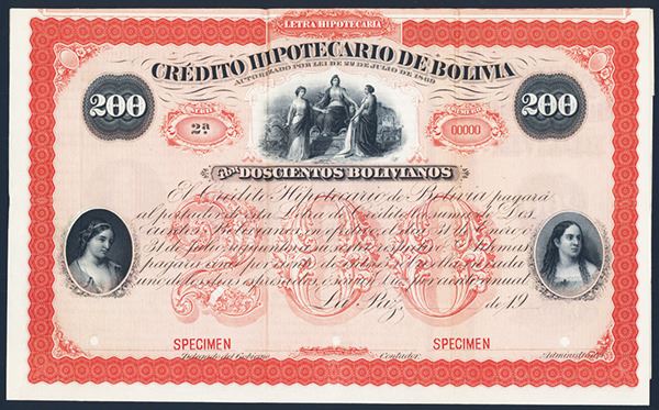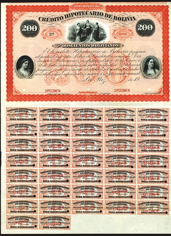 Bolivia, 19xx, 200 Bolivianos, Specimen Bond, Black on red border and underprint, Vignettes on left and right of women and top center of three allegorical women, VF-XF condition, ABNC.