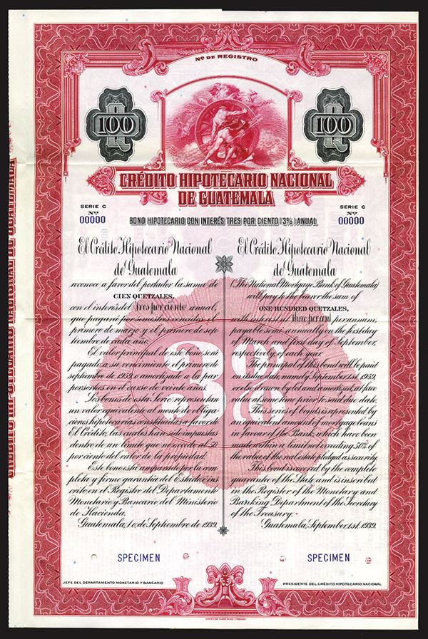 Guatemala. 100 Quetzales 3% Specimen Bond, Series C, red frame and major design elements, black 100 Q counters, ABNC, EF.