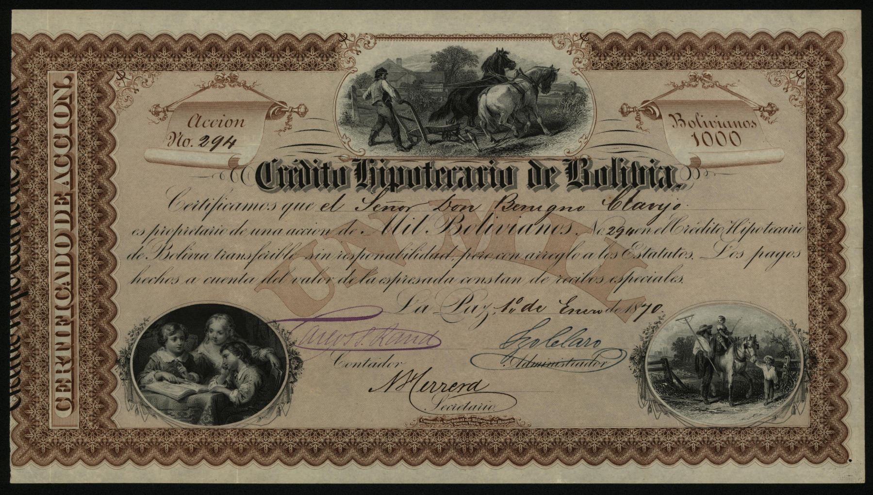 La Paz, Bolivia, 1870, One Share = 1000 Bolivianos, Farmer plowing, three girls, farmer and children, Brown, VF+. National BNC. Extremely attractive certificate.