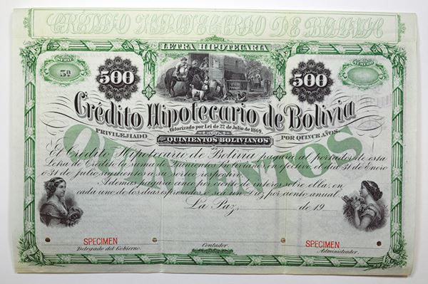 Bolivia. La Paz. Credito Hipotecario de Bolivia. 500 Bolivianos, 19xx. With coupons. ABNC imprint. Specimen. VF+