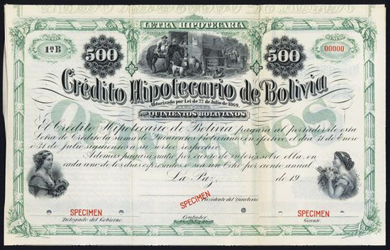 Bolivia, 19xx, 500 Bolivianos, Series 1B Specimen Bond, Coupons attached, Black on green border and underprint, Vignettes on bottom left and right of women and top center of young man on horse at mill with young girl tugging on harness, Red SPECIMEN overprints POC's and red s/n Ò00000Ó, VF-XF condition, ABNC.