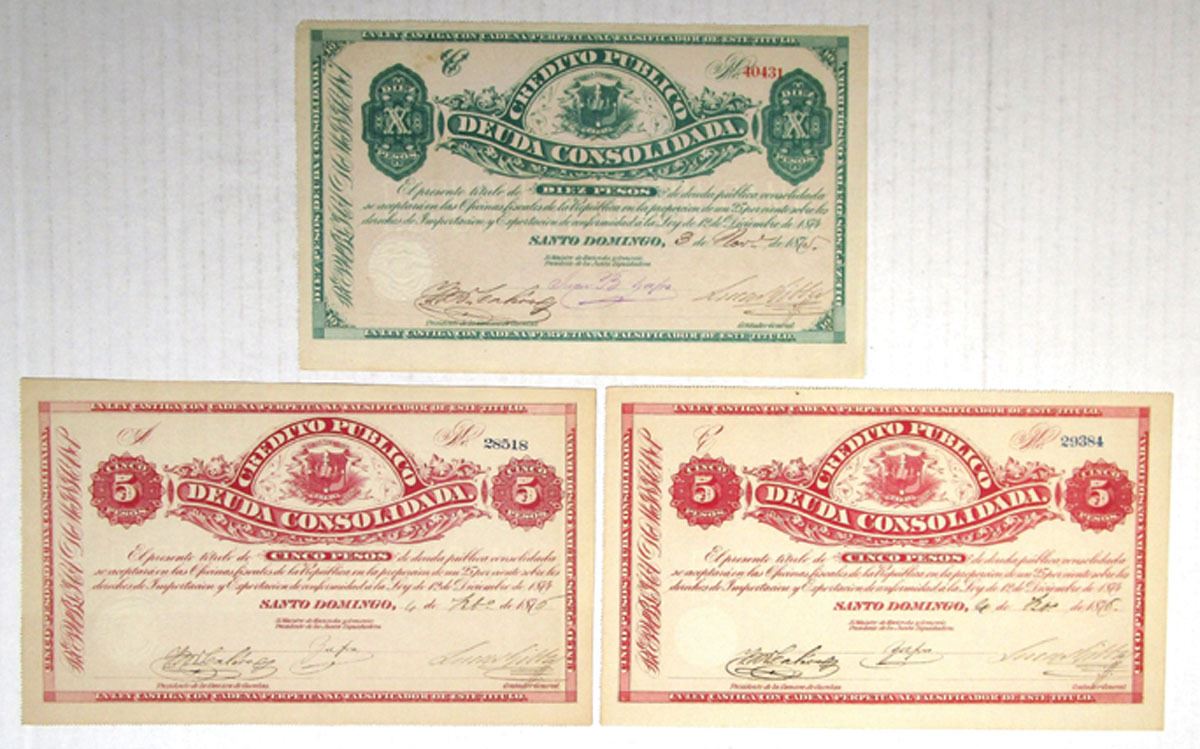 Santo Domingo, Dominican Republic, 1875-76. Lot of 3 I/U Bonds, Includes: 5 Pesos, P-S161 (2), Red with arms at top center, S/Ns 28518 & 29384; 10 Pesos, P-S162, Green with arms at top center, S/N 40431. Bonds range from VF to XF condition. (3). Sold "AS IS" no returns accepted.