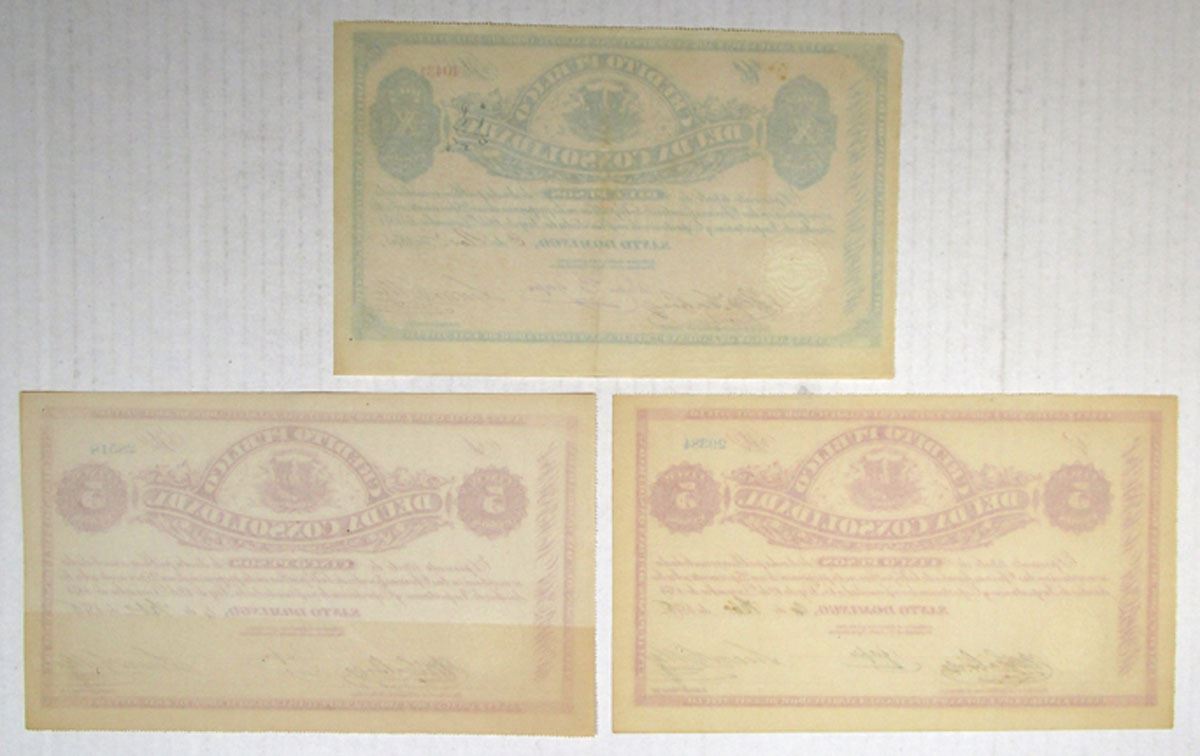 Santo Domingo, Dominican Republic, 1875-76. Lot of 3 I/U Bonds, Includes: 5 Pesos, P-S161 (2), Red with arms at top center, S/Ns 28518 & 29384; 10 Pesos, P-S162, Green with arms at top center, S/N 40431. Bonds range from VF to XF condition. (3). Sold "AS IS" no returns accepted.