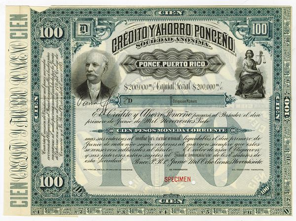 Ponce, Puerto Rico. 1897. 100 Pesos. Specimen bond. Black on dark green border and underprint, portrait of man on left, seated allegorical Justice on right and lion vignettes on back, VF condition but a small 2/3rds inch by 1/3rd inch is missing on the top left corner, POC's. ABNC. Rare Puerto Rico Bond. Banco Cr_dito y Ahorro PonceÐo (Ponce Credit and Savings Bank) was the first bank in Ponce, Puerto Rico, and one of the first two native Puerto Rican banks to be established in Puerto Rico. The bank was the first one to introduce a bank credit card to the Puerto Rican market. Founded in 1895, Banco Cr_dito built its own first banking structure in 1924 at Calle Marina and CallejÑn Amor, in Ponce. This first branch office, located in what is today the Ponce Historic Zone, has since been declared historic and was listed in the National Register of Historic Places