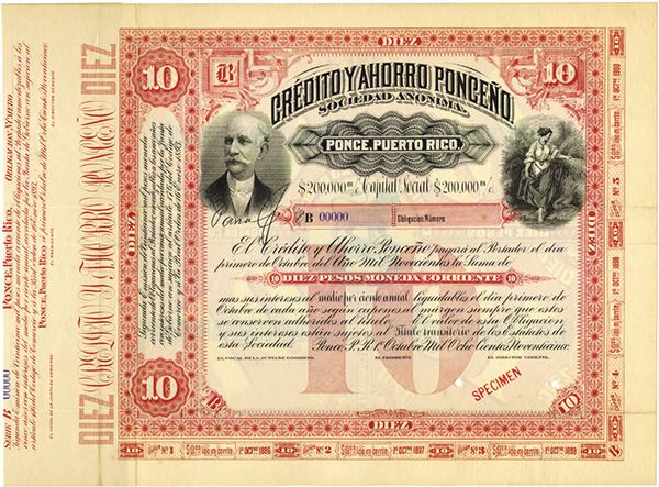 Puerto Rico, 1895, 10 Pesos, Specimen bond. Ornate title with allegorical woman on right and portrait of notable on left. Red border. Red specimen overprint, "0000" serial numbers and POC's. Rare early Puerto Rico bond. VF condition. ABNC. (From the collection of John E. Herzog).
