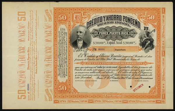 Ponce, Puerto Rico. 1895. 50 Pesos. Orange border with portrait of man on left, woman on right with scales and lion vignettes on back. POC. VF. ABNC. Rare Puerto Rico bond.