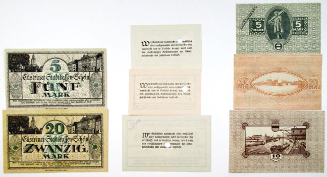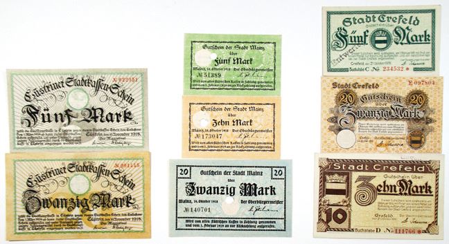 Germany. Lot includes 8 notes from Crefeld a trio of 5, 10, and 20 Mark; from KŸstrin (Kostrzyn, Poland) a pair of 5 and 20 Mark; and from Mainz a trio of 5, 10, and 20 Mark, all with POCs. XF to About Unc. (8)