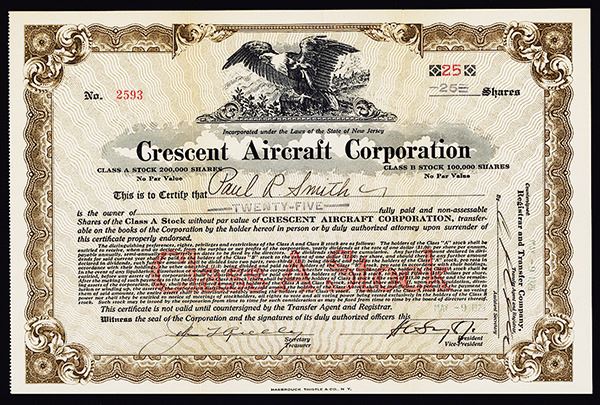 New Jersey. 25 Shares Class A, I/U Stock Certificate. Black ink with brown border and red under print. Vignette of American Bald Eagle at top of certificate. VF, Hasbrouck Thistle and Co Printers. Rare and historic aviation certificate. In July of 1929 Clarence Chamberlain, president, attempted to set a new endurance record. His plane was a Crescent monoplane retrofitted to make fueling contacts with a Goebel Chamberlain ship. The prospect for an airport in Jersey City came about after the transatlantic flights of Charles Lindbergh and the interest of a little-known transatlantic aviator Clarence D. Chamberlin in 1927. Chamberlin came into Jersey City to advance the new air travel industry with his airplane manufacturing plant and flight school, known as Crescent Aircraft Corporation, at Droyers Point. Chamberlin became a representative of the Jersey City Chamber of Congress and was named manager of the airport project.
