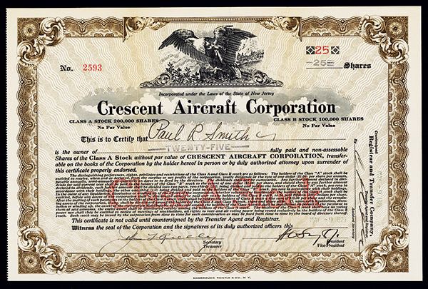 New Jersey. 25 Shares Class A Stock, Issued and Uncanceled Certificate. Black ink with brown border and red under print. Vignette of American Bald Eagle at top of certificate. VF, Hasbrouck Thistle and Co Printers. Rare and historic aviation certificate.