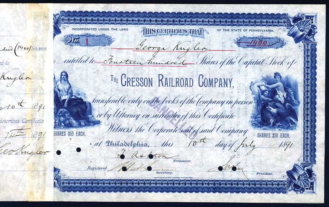 Philadelphia, Pennsylvania, 1400 Shares I/C, Blue printing, Seated allegorical woman on left on cornucopia and Liberty with cherub and eagle on right, VF. Only variety of certificate known on this railroad. The line was active for only 23 days. 25 reported issued.