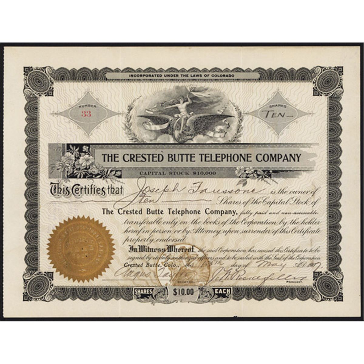 Crested Butte, Colorado, 1907, 10 shs., Issued and endorsed Stk. certificate, black border with allegorical person on winged railroad wheel, gold company seal, Cert.#33, XF condition.